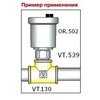 (VT.539.N) Отсекающий клапан обеспечивает возможность установки и демонтажа автоматического воздухоотводчика VT 502 без опорожнения системы. Состоит из никелированного латунного корпуса, пластикового золотника и резинового уплотняющего кольца. В верхнем положении золотник удерживается пружиной из нержавеющей стали. Клапан устанавливается на трубопровод перед воздухоотводчиком.