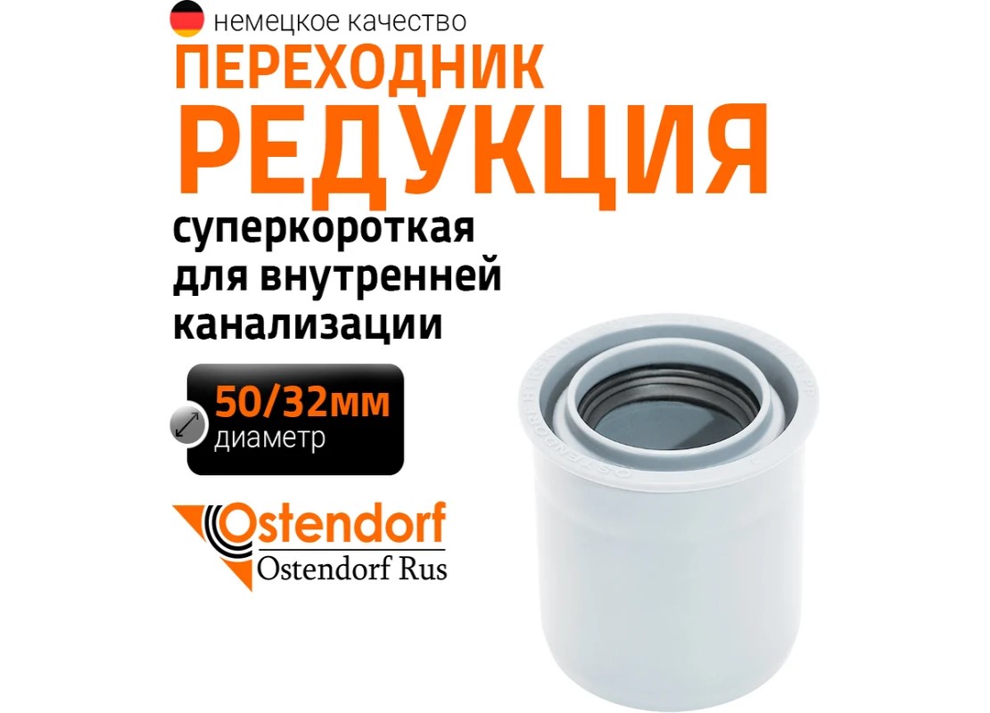 Компания Ostendorf предлагает суперкороткую редукцию (переход), которая обеспечивает надёжный переход с 50 мм на 32 мм. Переход практически не имеет строительной длины и выступает всего на 1,8 мм, что позволяет сэкономить пространство и замаскировать соединение под декоративный отражатель сифона.