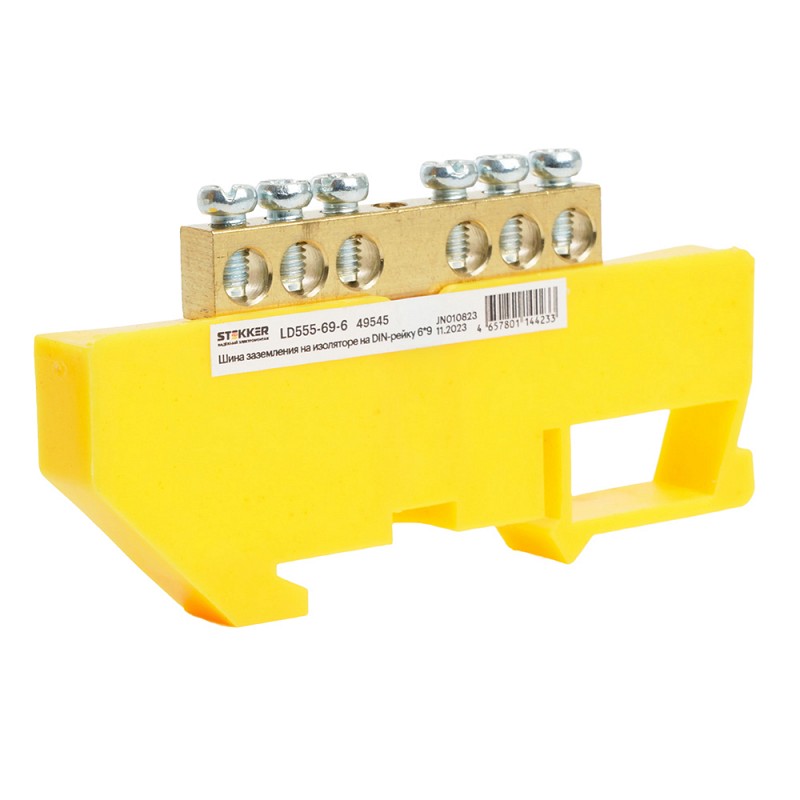 Шина "PE" нулевая 6x9 мм 6 отверстий с изолятором на Din-рейку