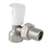 Угловой радиаторный клапан. Основное назначение – ручное плавное регулирование расхода теплоносителя через отопительный прибор. При замене регулировочной ручки на защитный колпачок может использоваться в качестве настроечного клапана. Наличие полусгона позволяет монтировать и демонтировать клапан без демонтажа трубопровода. Ремонтопригодный. Рабочая температура – до 110 °С, давление – до 10 бар. Резьба присоединений – внутренняя/наружная.