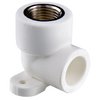 Комбинированный угловой фитинг с креплением (полипропиленовая водорозетка), предназначенный для подсоединения к полипропиленовому трубопроводу сантехнического смесителя или другого компонента инженерной системы с резьбовым подключением. Резьба фитинга – внутренняя трубная по ГОСТу 6357.