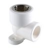 (VTp.754.0) Комбинированный угловой фитинг с креплением (полипропиленовая водорозетка), предназначенный для подсоединения к полипропиленовому трубопроводу сантехнического смесителя или другого компонента инженерной системы с резьбовым подключением. Резьба фитинга – внутренняя трубная по ГОСТу 6357.